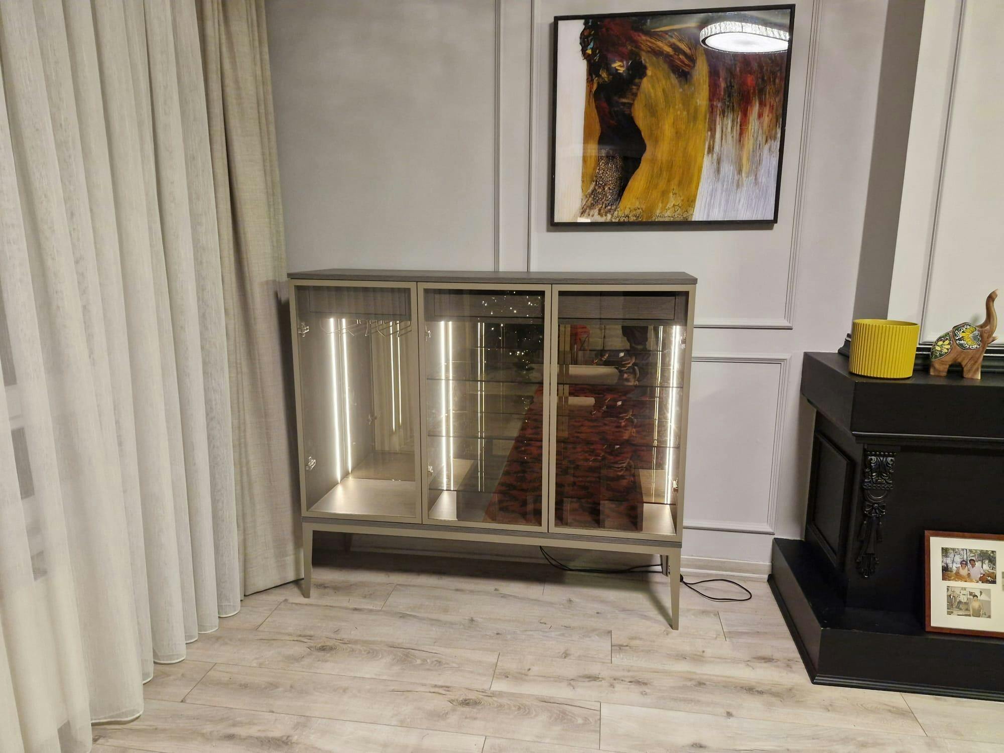 The interior LED lighting highlights bottles and glasses, making them more practical to use, while creating a dim atmosphere and adding a warm feel to the space. A horizontal compartment with a capacity for three bottles ensures organized storage of beverages, while four rows of glass hooks keep glasses securely and easily accessible. Three drawers offer ample storage space for special serving items such as bottle openers, corkscrews, and strainers.