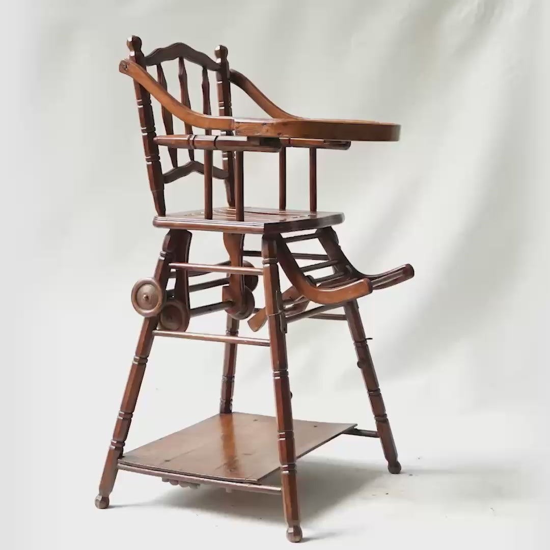 This unique antique wooden high chair features a design that stands out with its functionality and elegance. It can be converted into a walker and also used as a high chair for feeding. Perfectly complementing any interior decor, the handcrafted details reflect the quality and meticulous design of the product