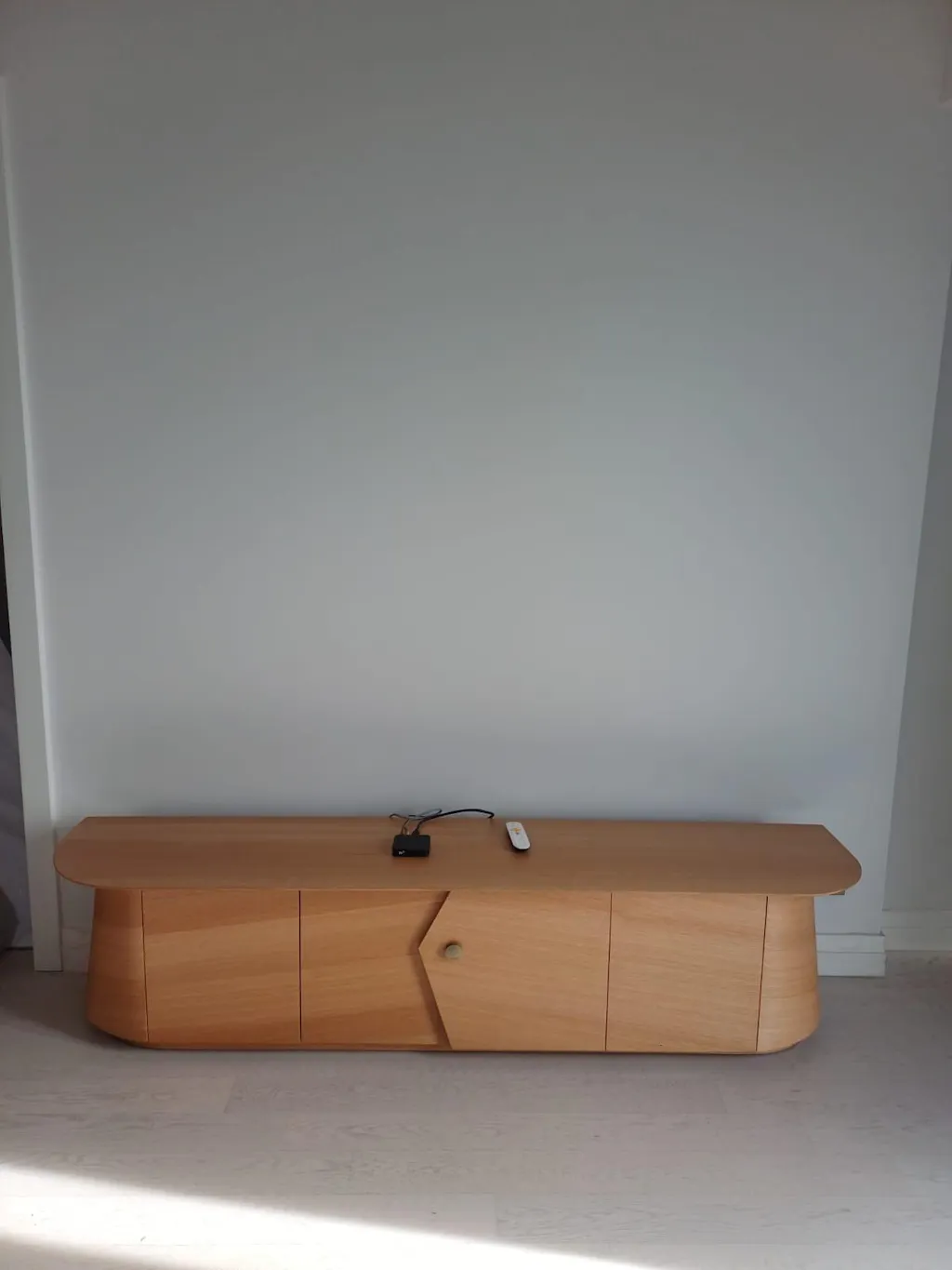 The warmth of natural oak adds a soft balance to this sculptural stance, creating an intimate atmosphere in the living space. The brass handle and folding detail in the central section stand out as the unit's signature feature, setting the rhythm of the whole.