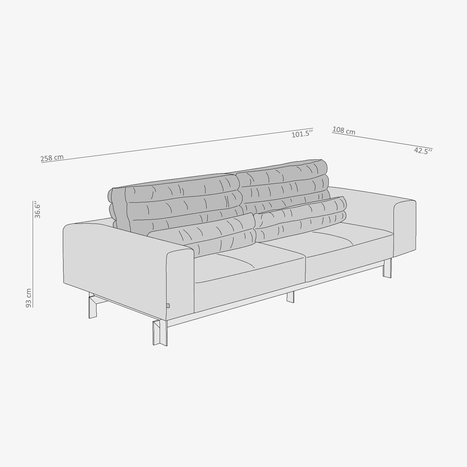 Katmanlı sırt minderleri, kanepeye dinamik bir ritim kazandırırken oturuma davetkar bir konfor ekler. Siyah suni deri yüzey, çevresine etkileyici bir atmosfer yayar.