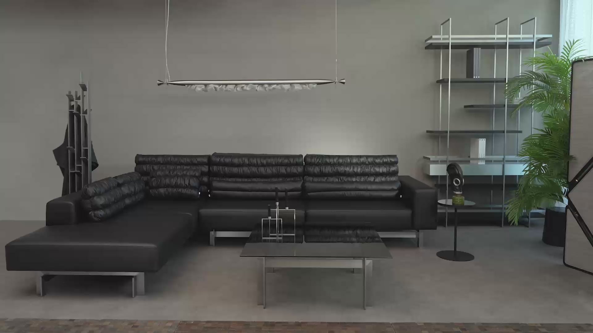 Siyah suni deri döşemesi, ışığı zarifçe yakalayan derin bir matlığa sahip. Katmanlı sırt minderleri, heykelsi bir form yaratırken rahatlığı ön planda tutar.