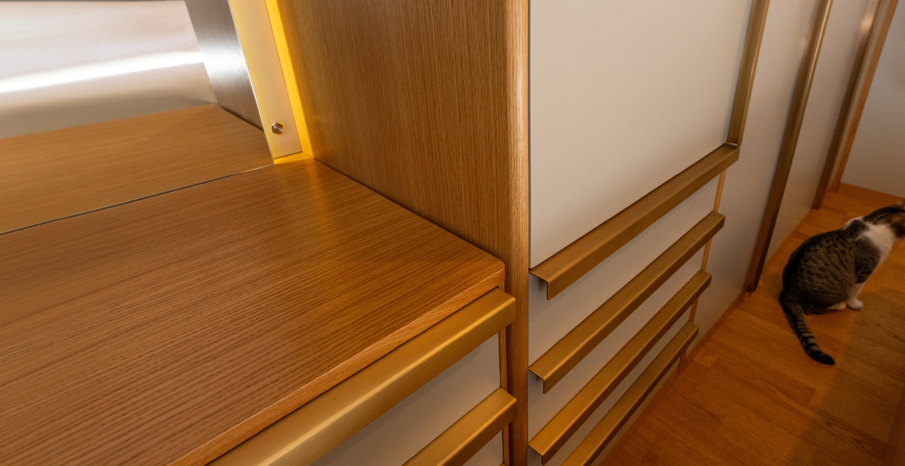 Mekânın her köşesi kullanıcı alışkanlıkları, günlük ritüeller ve estetik beklentiler dikkate alınarak tasarlandı. Sadece yaşam alanı değil, aynı zamanda kişisel bir ifade alanı yaratmayı hedefleyen projede hem sabit hem de hareketli mobilyalar atölyelerimizde özel olarak üretildi.