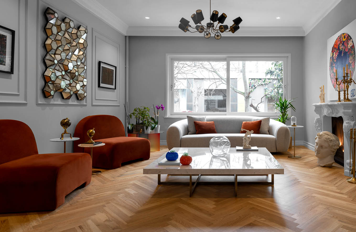 Harbiye'deki evde kişiye özel mobilyalar kullanılan ev, lagu tamamlayıcı aksesuar ve dekoratif heykelleri ile zenginleştirildi. Tasarım müşterinin taleplerine göre şekillendirildi.