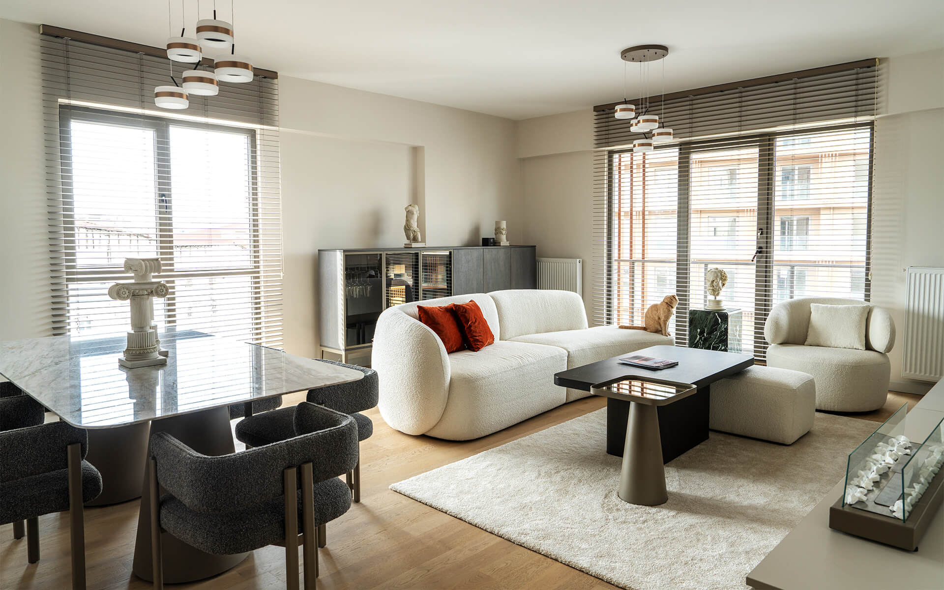 Kullanılan her detay, yalnızca estetik bir duruş değil, aynı zamanda ev sahiplerinin yaşam alışkanlıklarına da yanıt veren işlevsellik kazandırdı.