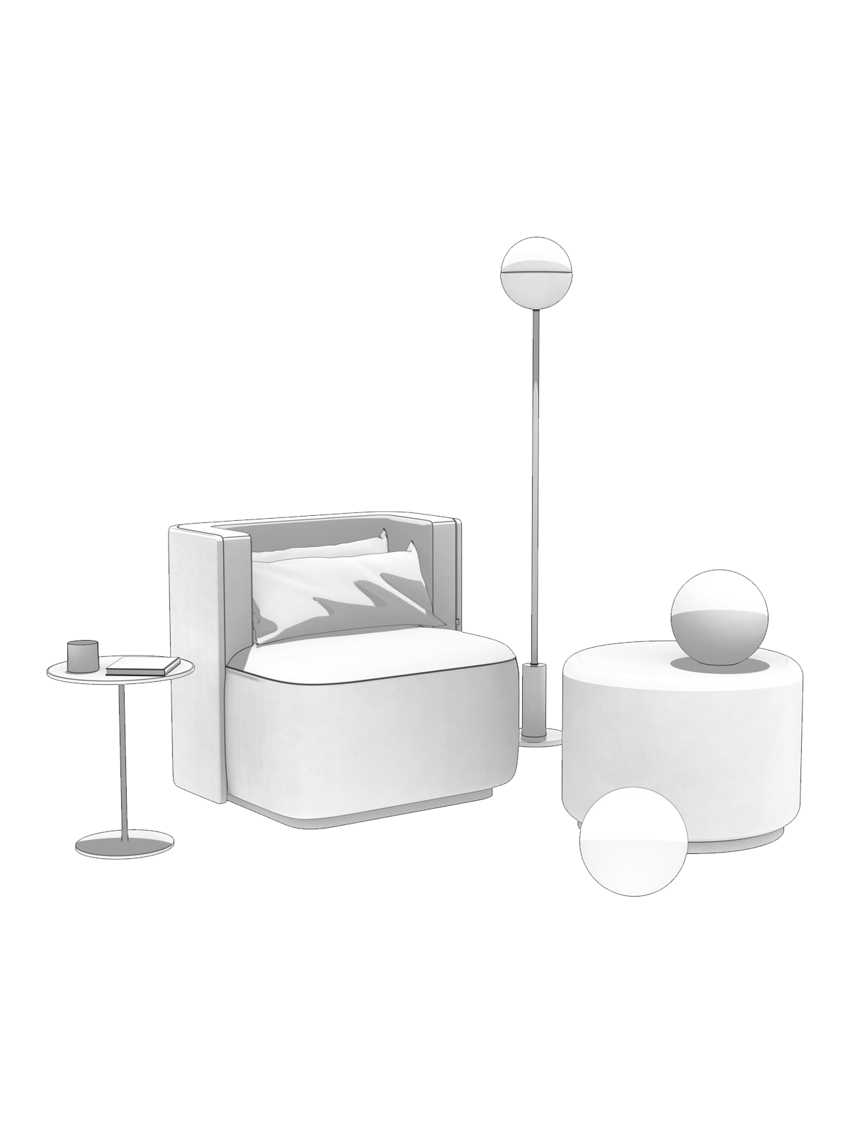 ARTHUR modüler kanepe ve koltuk, RECALLED yuvarlak masa, BASIC raf sistemi, SOSA koltuk ve FAMED orta sehpa ile bütünlük yaratıyor.