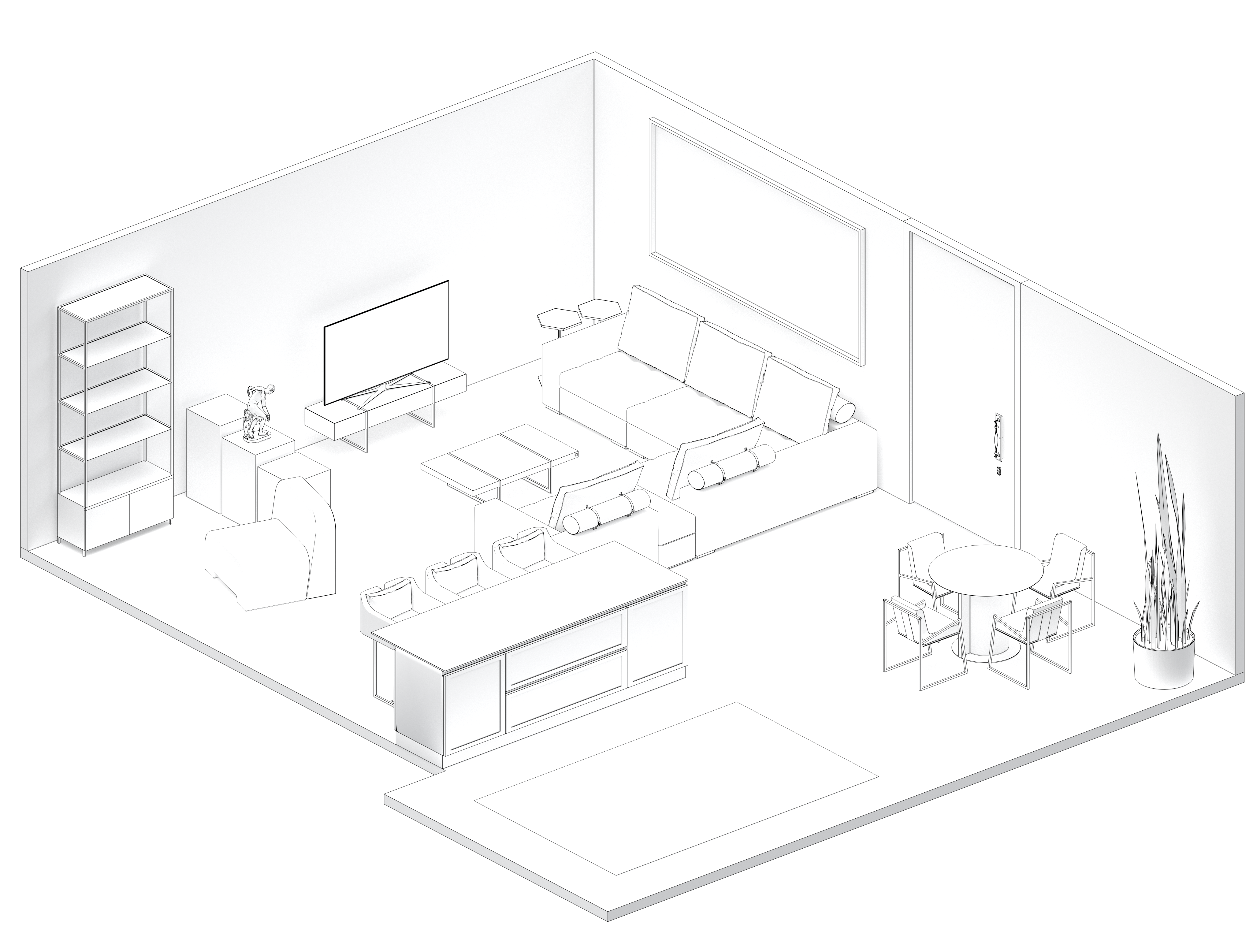 Bu oturum planı, modern salon dekorasyonu için dengeli, şık ve fonksiyonel bir çözüm sunuyor. Lagu’nun mobilya yerleşim önerileri ile yaşam alanınızı çağdaş bir düzenle tamamlayabilirsiniz.