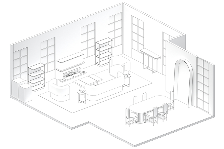 ARTHUR modüler kanepe ve koltuk, RECALLED yuvarlak masa, BASIC raf sistemi, SOSA koltuk ve FAMED orta sehpa ile bütünlük yaratıyor.