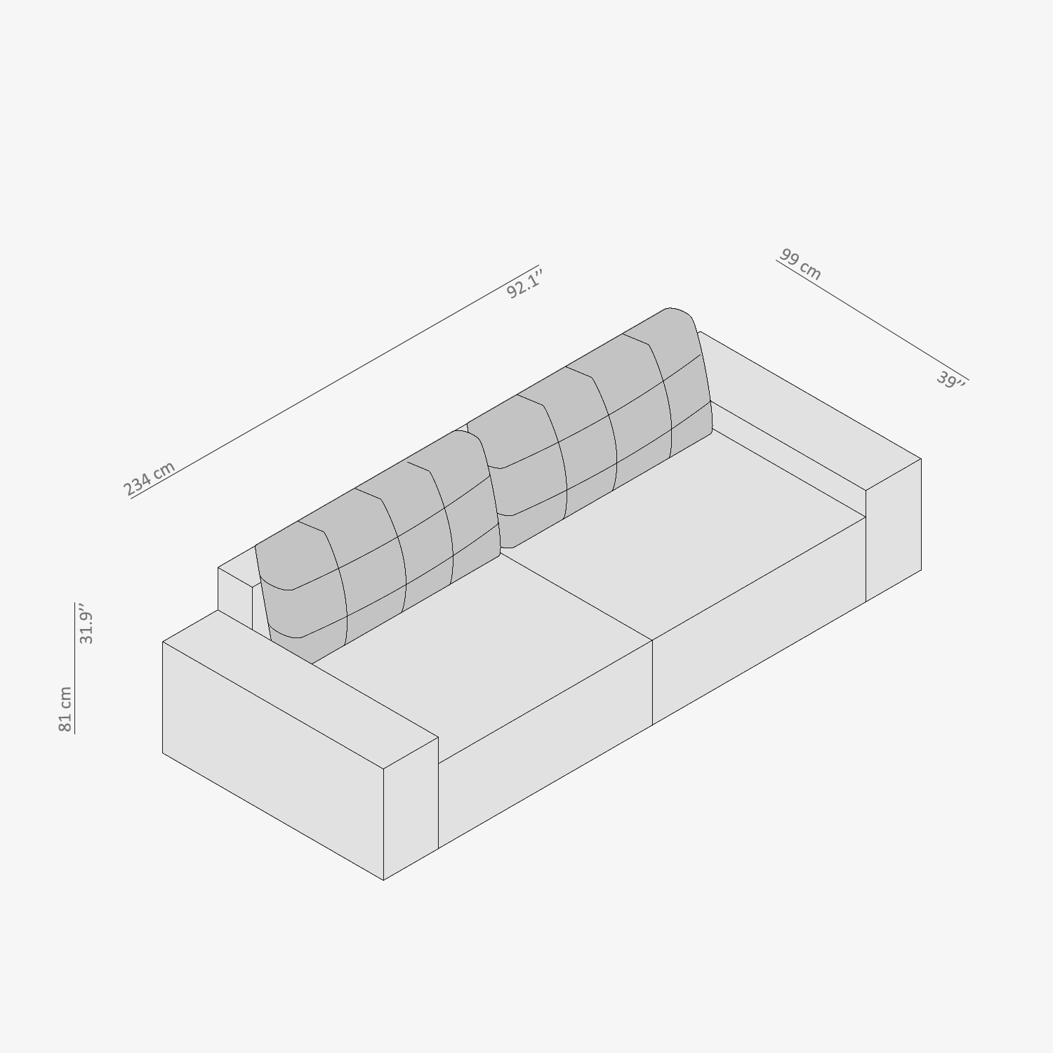 Ruga İkili Kanepe, simetrik formu ve özenle işlenmiş dikiş detaylarıyla modern sadeliği ve konforu bir araya getirir. Kompakt ölçüleriyle hem küçük hem de geniş mekânlarda rahatlıkla kendine yer bulur; dengeli oranlarıyla bulunduğu ortama zarif bir uyum sağlar.