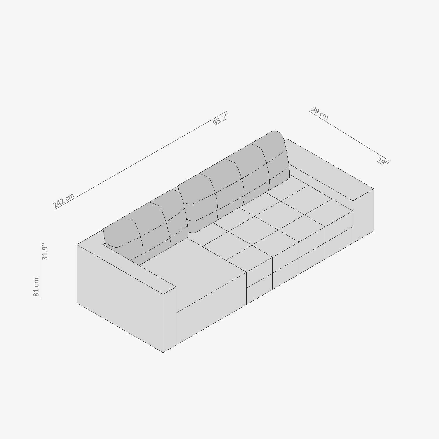Ruga Üçlü Kanepe, asimetrik dikiş ve kolçak tasarımıyla güçlü bir tasarım dili ortaya koyar. Geniş oturum alanı, rahatlığı öncelik haline getirirken; özgün dikiş detayları ve formundaki asimetriyle modern bir estetik sunar.