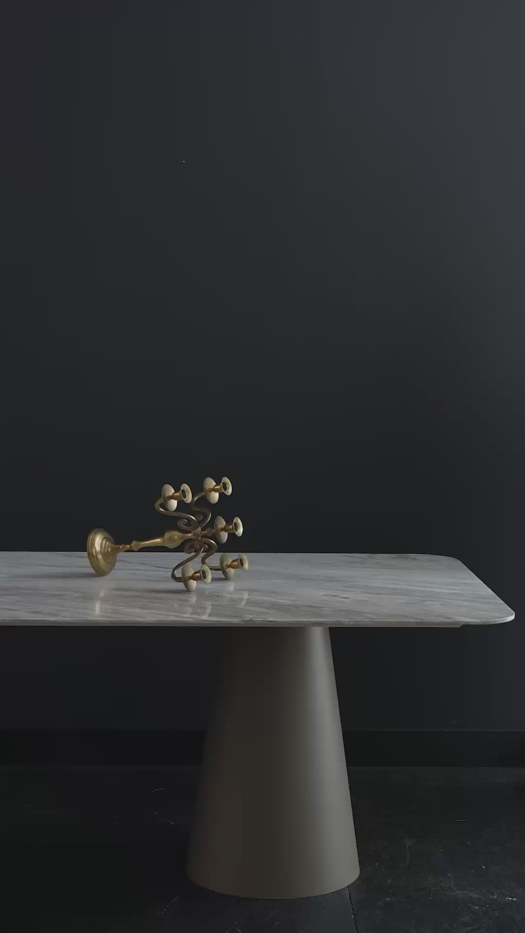 Sekiz kişilik geniş oturma alanı sunan yapısıyla, konforlu ve ferah bir kullanım sağlıyor. İki adet metal konik ayağın güçlü duruşu, mermer tablanın doğal dokusuyla kusursuz bir uyum sağlıyor. Şıklığı ve işlevselliği bir araya getiren bu masa, her detayında incelikle düşünülmüş bir tasarım anlayışını yansıtıyor.